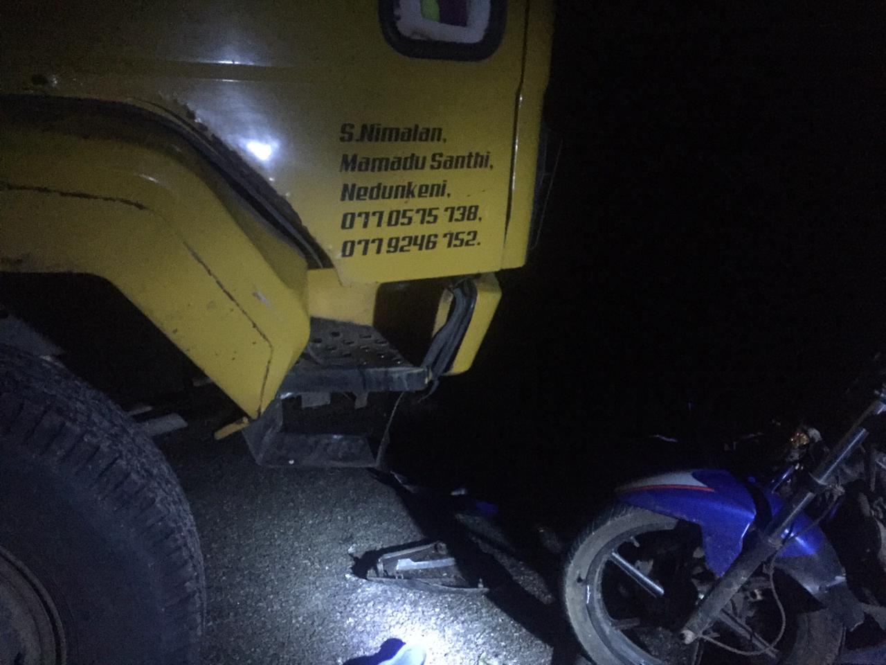 புதுக்குடியிருப்பு வற்றாப்பளை வீதியில் கேப்பாபுலவுப் பகுதியில் டிப்பர் மோட்டார் சைக்கில் விபத்தில் இருவர் உயிரிழந்ததோடு மேலும் ஒருவர் படுகாயமடைந்தார்.