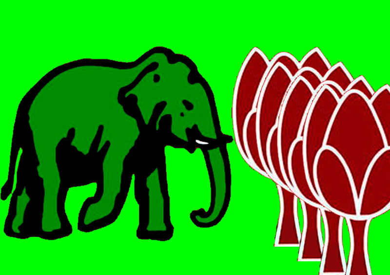 யானைக் கட்சியோ மொட்டுக் கட்சியுடன் சேர்ந்து போட்டியிடுவதற்குத் தயாராக இருக்கின்றது.