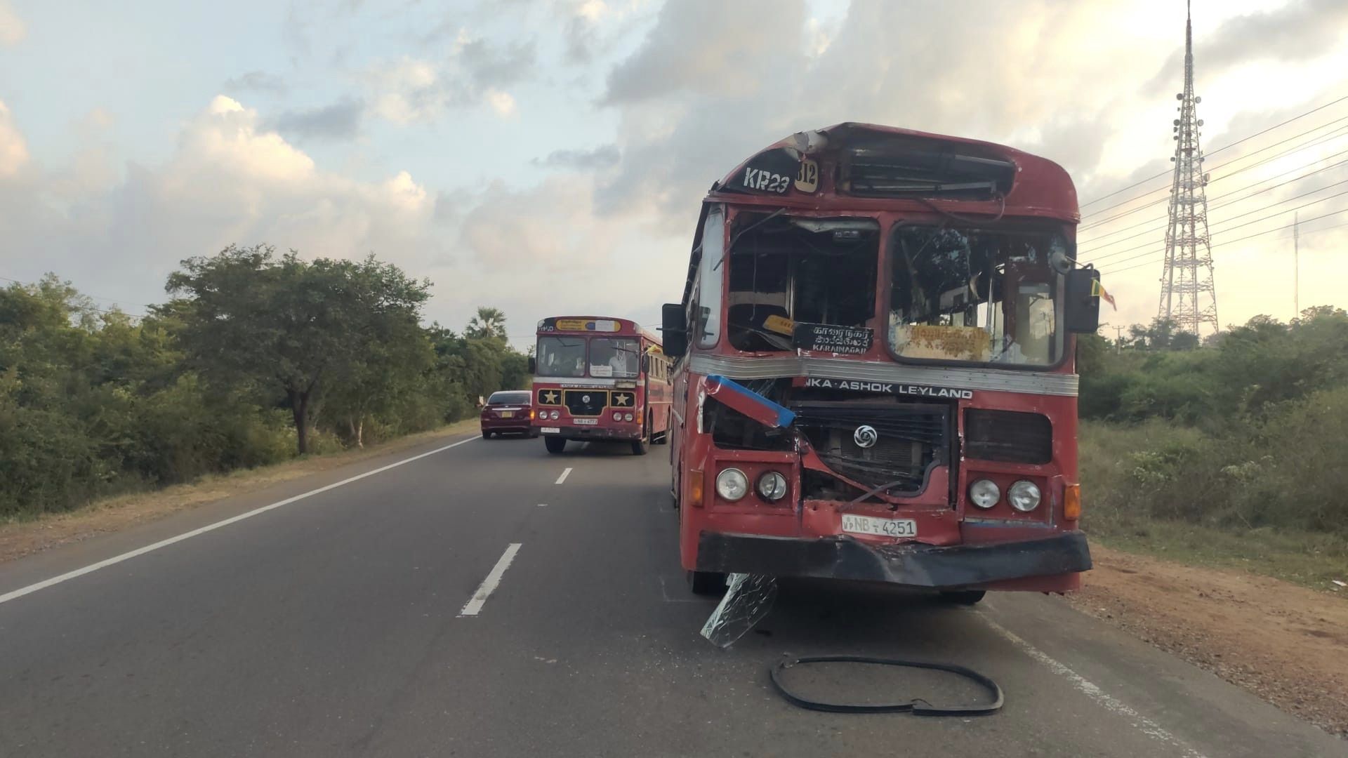 துணுக்காயிலிருந்து காரைநகர் நோக்கி பயணித்த இலங்கை போக்குவரத்து சபைக்குச் செந்தமான பஸ் எதிரே பயணித்த இராணுவ ட்ரக் வாகனத்துடன் நேருக்கு நேர் மோதியுள்ளது.