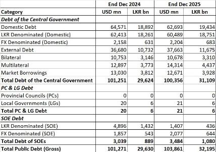 2025 ஆம் ஆண்டு இறுதியில் இலங்கையின் மத்திய அரசின் மொத்த கடன் தொகை ரூபாய் 31,109 பில்லியன் என பதிவாகியுள்ளது. இது 2024 ஆம் ஆண்டு இறுதியில் இருந்த அளவுடன் ஒப்பிடுகையில் 5.1% அதிகரிப்பாகும்.