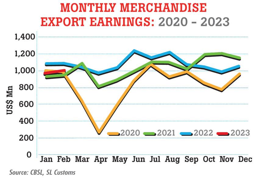 இது 2023 ஆம் ஆண்டின் முதல் இரண்டு மாதங்களில் இலங்கையின் ஒட்டுமொத்த ஏற்றுமதி வருமானம் 1.98 பில்லியன் அமெரிக்க டொலர்களாகும். ஜனவரி-பிப்ரவரி 2022 உடன் ஒப்பிடும் போது, வருவாய் 9.68 சதவீதம் குறைந்துள்ளது.