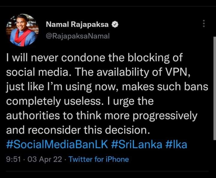 அதிகாரிகள் மேலும் முற்போக்கான விதத்தில் சிந்திக்க வேண்டும். சமூக ஊடகங்களை முடக்கும் முடிவை மீள்பரிசீலனை செய்யவேண்டும் என நான் வலியுறுத்துகின்றேன் என நாமல் தெரிவித்துள்ளார்.