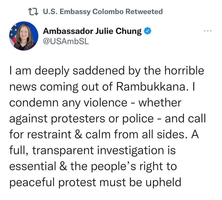 ரம்புக்கனை துப்பாக்கிச்சூடு சம்பவத்தில் பொதுமகன் கொல்லப்பட்டமை தொடர்பில் விரிவான விசாரணை நடத்தப்பட வேண்டும் என இலங்கைக்கான அமெரிக்கத் தூதுவர் வலியுறுத்தியுள்ளார்.