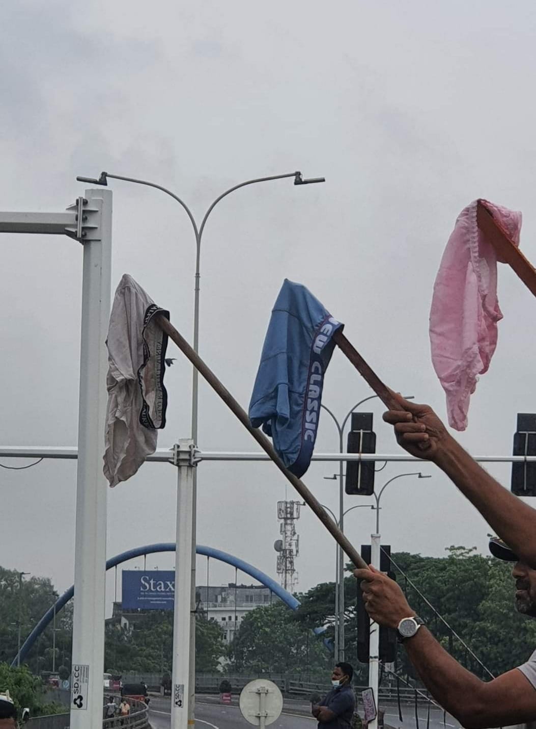இதன்போது ஆண் பெண் உள்ளாடைகள் பொலிஸ் தடுப்பு இரும்புகள் மீது அரசாங்கத்திற்கும் ஜனாதிபதிக்கும் எதிரான வாசகங்களுடன் தொடங்கவிடப்பட்டன.