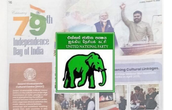 இந்தியாவின் 79வது சுதந்திர தினத்தையொட்டி இலங்கையில் அச்சு ஊடகங்களில் வெளியிடப்பட்ட விளம்பர துணைப் பொருட்கள் குறித்து ஐக்கிய தேசியக் கட்சியின் உயர்மட்ட அதிகாரிகளின் கூட்டம் மிகுந்த கவனத்தை ஈர்த்துள்ளதாகத் தெரிவிக்கப்படுகிறது.