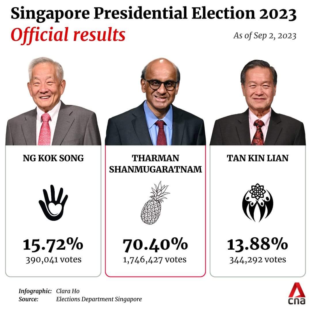 முன்னாள் துணைப் பிரதமரும் ஆளும் கட்சி வேட்பாளருமான தர்மன் சண்முகரத்தினம், 66, சிங்கப்பூர் அதிபர் தேர்தலில் 70.4% வாக்குகளைப் பெற்று அபார வெற்றி பெற்று, அதிபர் தேர்தலில் வெற்றி பெற்ற முதல் சீனரல்லாதவர் என்ற பெருமையைப் பெற்றுள்ளார்.