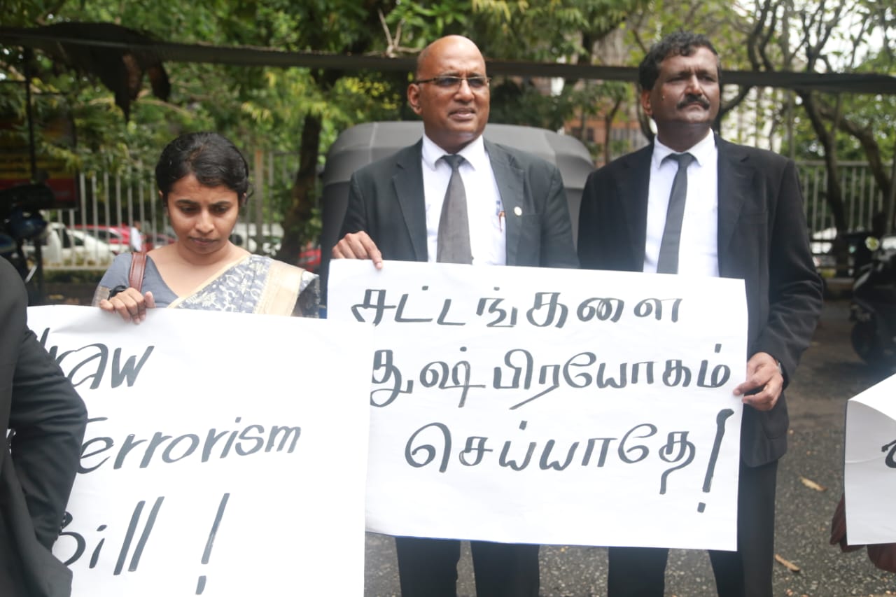 “சட்டத்தை ஆயுதமாக்கி மக்களை ஒடுக்குவதை எதிர்ப்போம்! அனைத்து ஒடுக்குமுறைச் சட்டங்களும் வாபஸ் பெறப்பட வேண்டும்!” என்ற தொனிப்பொருளில் இன்று (05) புதுக்கடை நீதவான் நீதிமன்றத்திற்கு முன்பாக சட்டத்தரணிகள் கவனயீர்ப்புப் போராட்டமொன்றை ஏற்பாடு செய்திருந்தனர்.