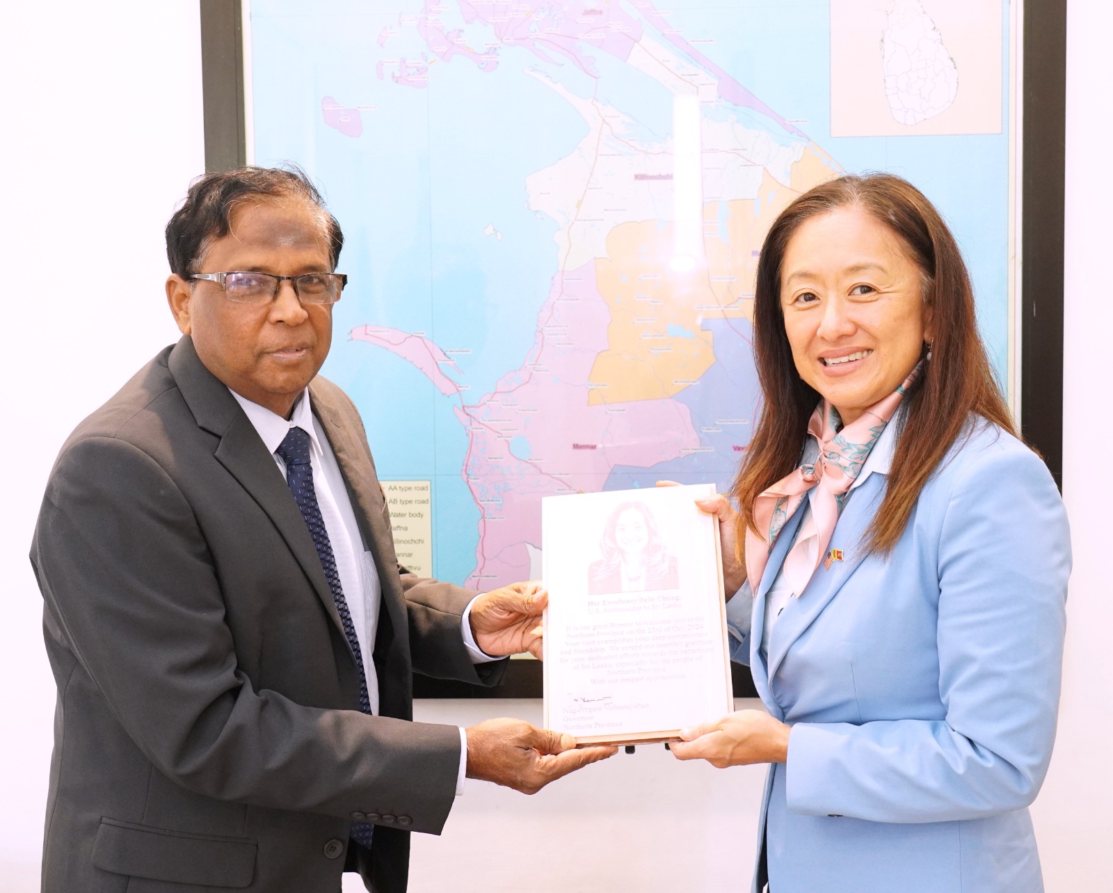 வடக்கு மாகாண ஆளுநர் நாகலிங்கம் வேதநாயகனை இலங்கைக்கான அமெரிக்கத் தூதுவர் ஜூலி சங் இன்று வடக்கு மாகாண ஆளுநர் அலுவலகத்தில் சந்தித்துக் கலந்துரையாடினார். இதன்போதே வடக்கு மாகாண ஆளுநர் மேற்கண்டவாறு கூறினார்.